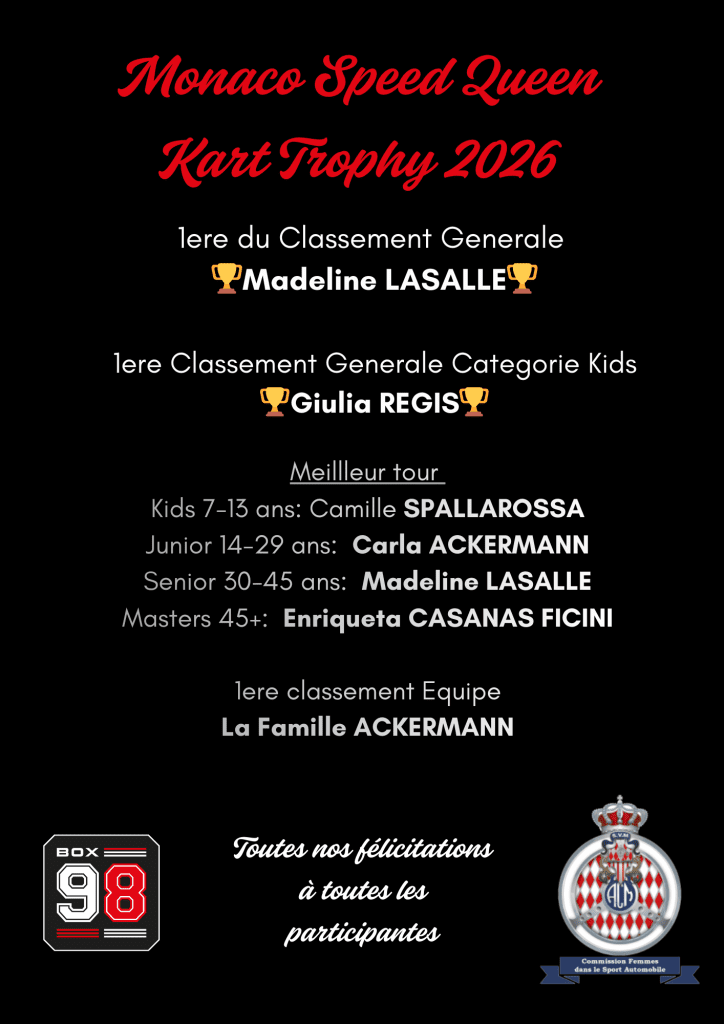 Les trophées de l’Automobile Club de Monaco ont été remis par Tiffaney Perlino, Présidente de la Commission Femmes dans le Sport Automobile de l’ACM, Charles Flaujac, Président de la Commission Karting de l’ACM, Céline Cottalorda du Comité des Droits des Femmes, ainsi que par Ella Hakkinen, Vicky Farfus et Lina Salamanca.