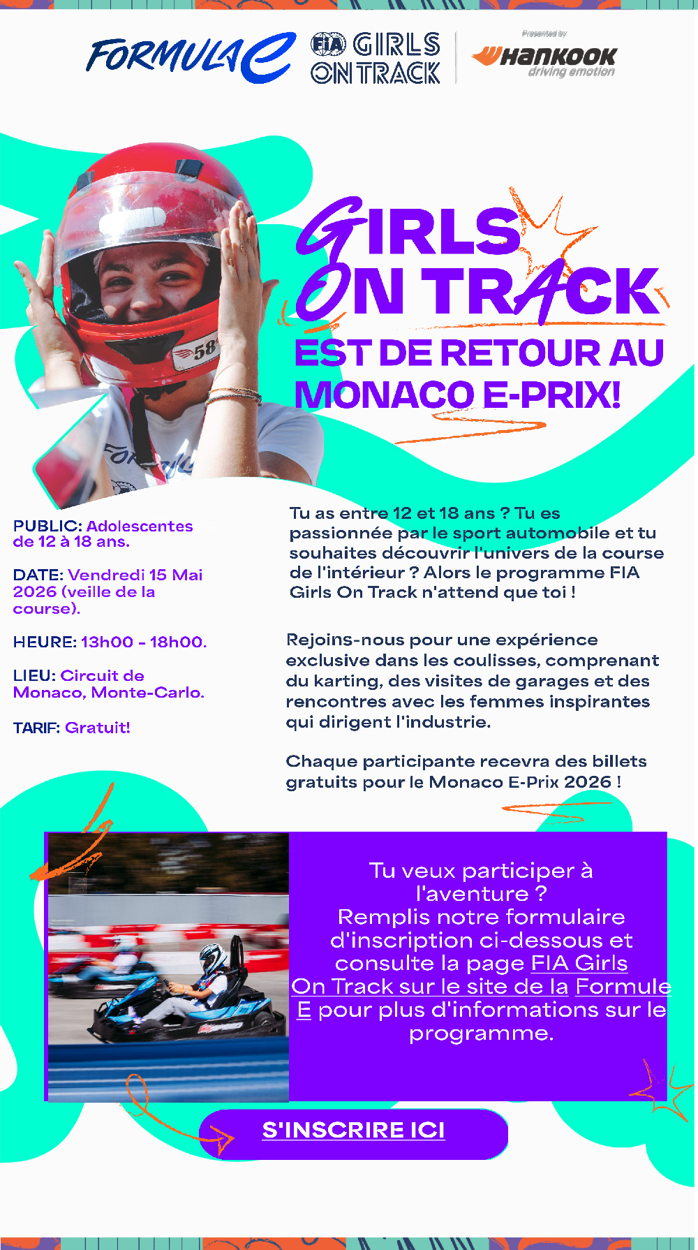 Are you passionate about motorsport? Would you like to go behind the scenes of Formula E? If you are between 12 and 18 years old, experience the 100% female immersion of FIA Girls on Track at the heart of the Monaco E-Prix!