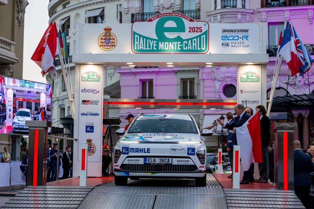 Lined up along the Place du Casino, 12 standout vehicles from this 2025 edition were put in the spotlight to attract spectators. Among them, the Hyundai Kona no. 1, driven by Michal Zdarsky and Jakub Nabelek, contenders for the Bridgestone FIA ecoRally Cup title, was the first car to leave the podium, waved off by His Serene Highness with the Monégasque flag.