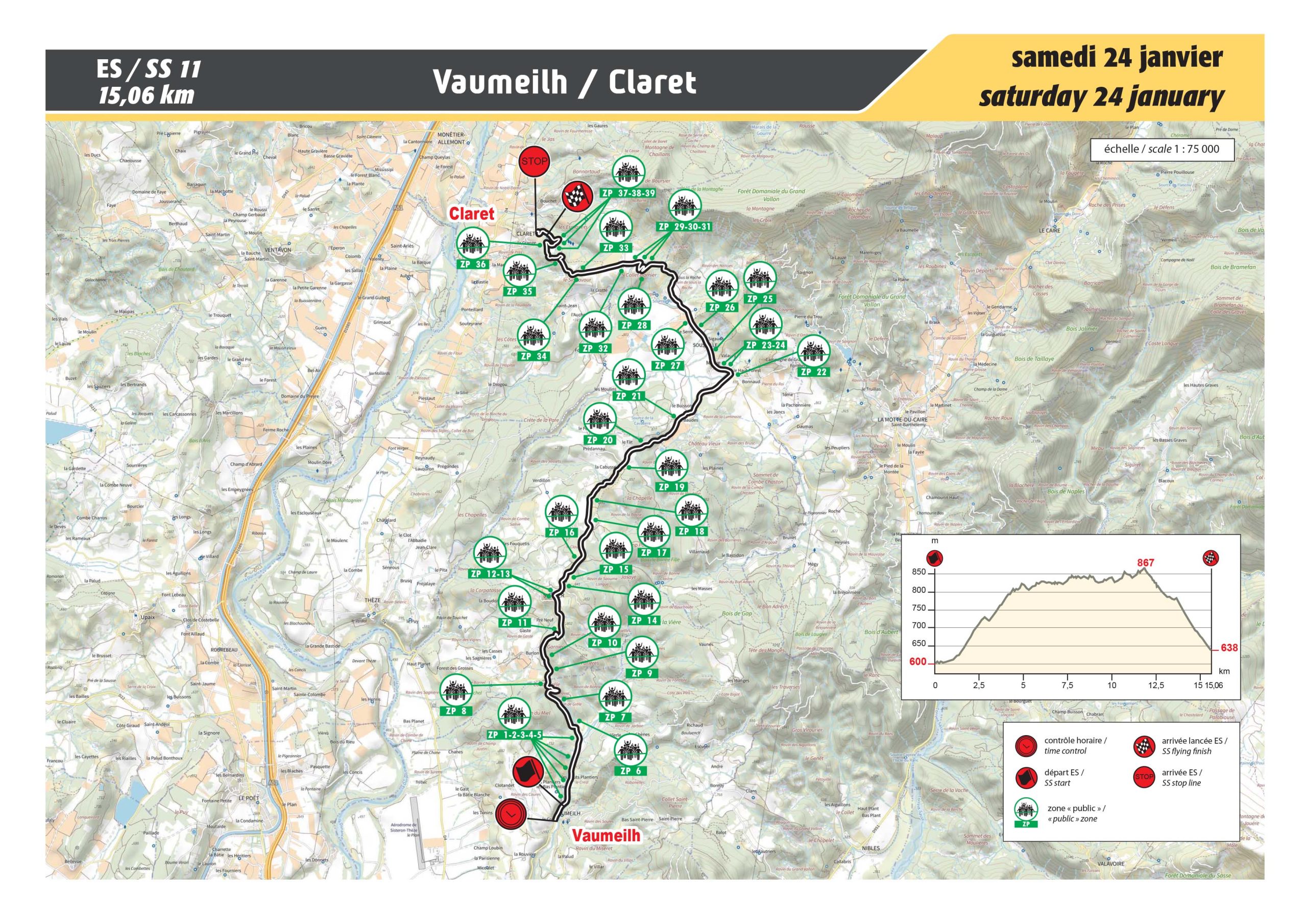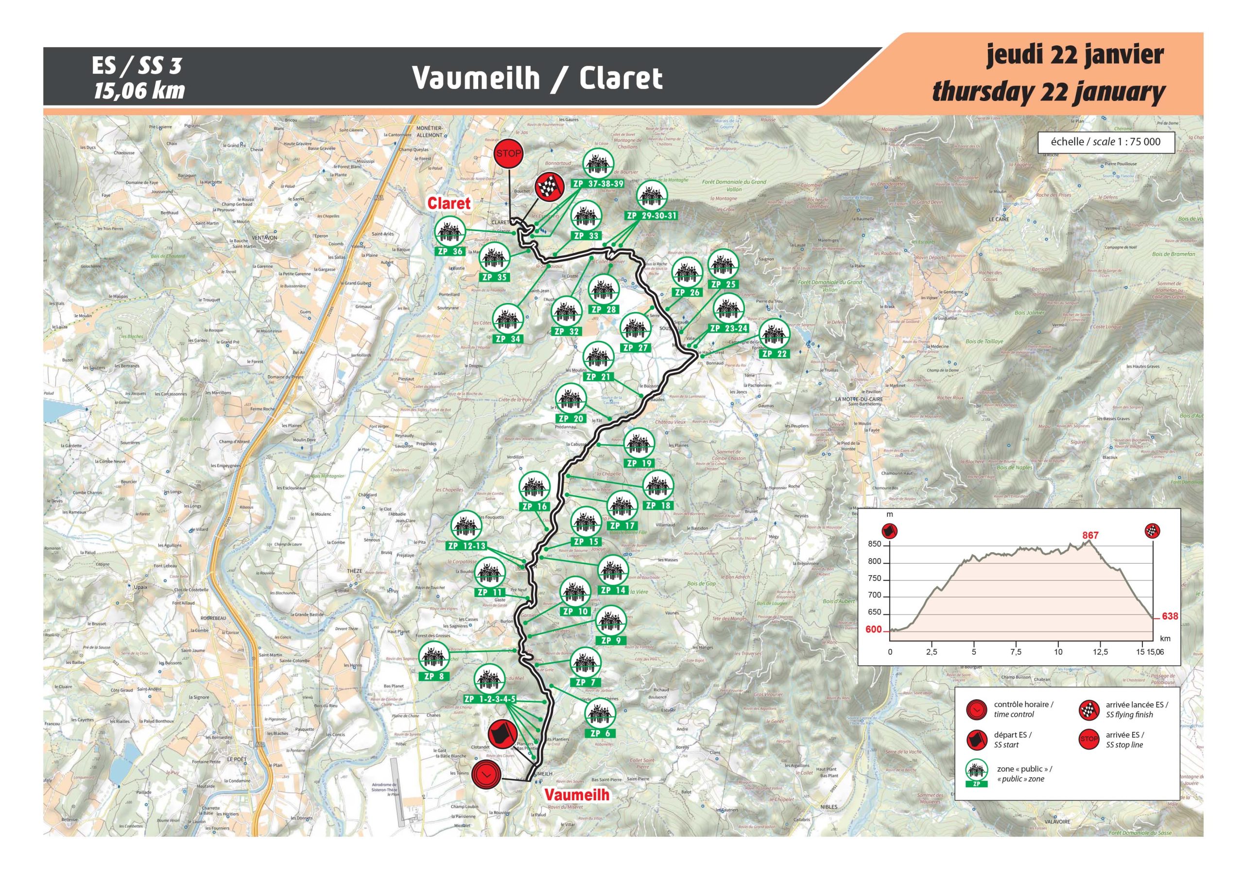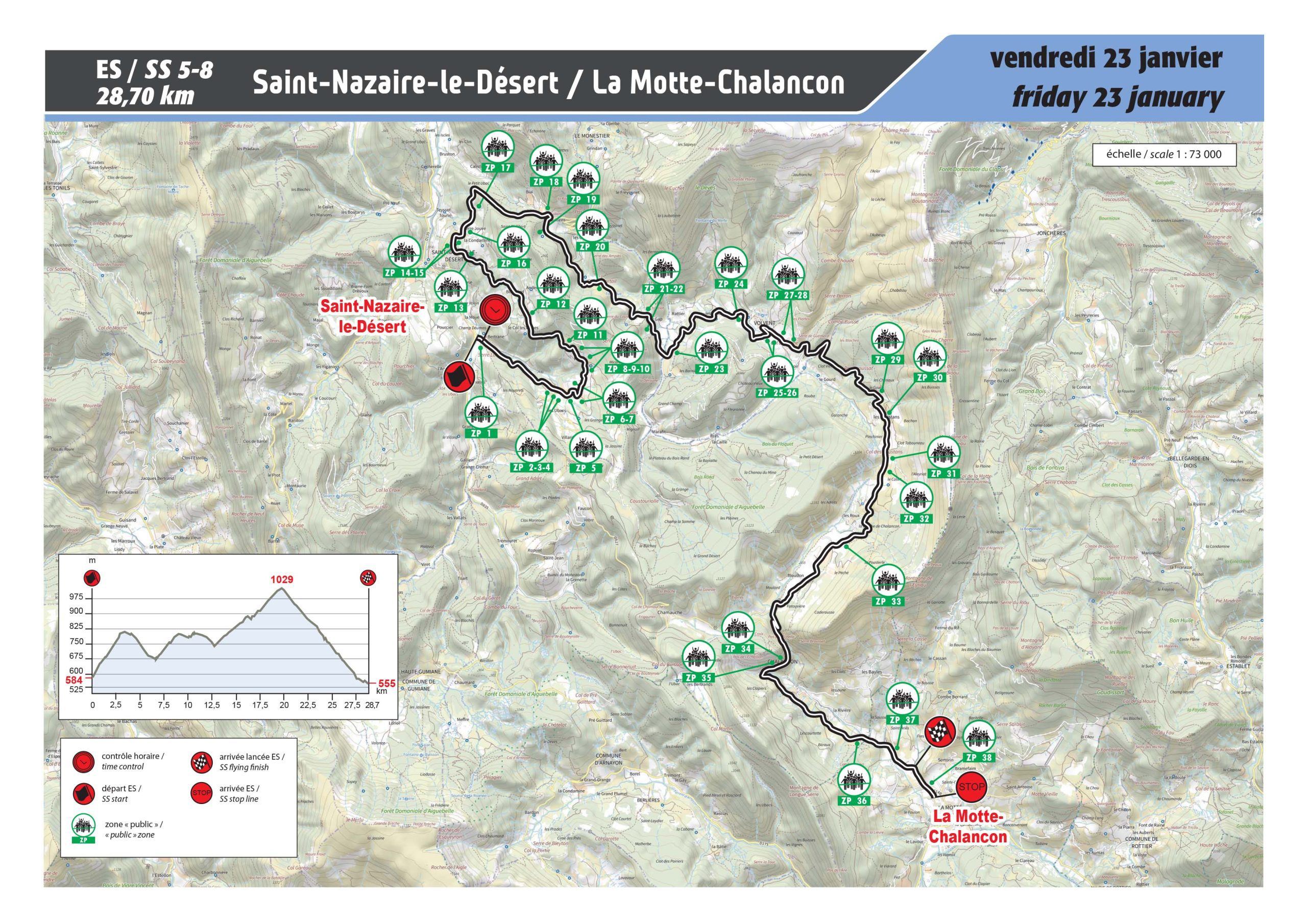 Introduite en 1978, empruntée pour la dernière fois dans ce sens en 2013 lors de 81e édition du Rallye Automobile Monte-Carlo, cette nouvelle version avec un départ inédit et une toute nouvelle arrivée à la Motte-Chalancon rend cette spéciale encore plus captivante. L’épreuve débute sur la partie finale et étroite de l’ES 10/13 « La Motte-Chalancon / Saint-Nazaire-le Désert » de l’année dernière. La montée ne présente aucune difficulté majeure jusqu’au Cols des Guillens (802m) et du Portail (805m) où seules quelques plaques de glace ou de neige peuvent venir corser la situation. La traversée spectaculaire, ensuite, de Volvent précède une nouvelle montée en direction des Cols de Vache (887m) et des Roustans (1030m). Le final est rapide et très rythmé en descente, avec une double épingle, suivi du passage dans une clue étroite précédant Chalancon, qui s’élargit ensuite en vue de l’arrivée…