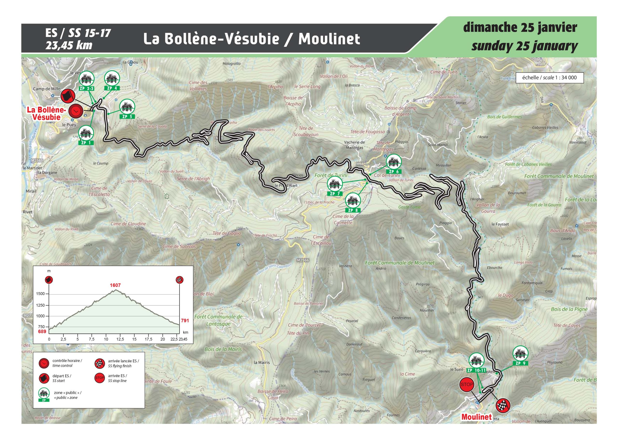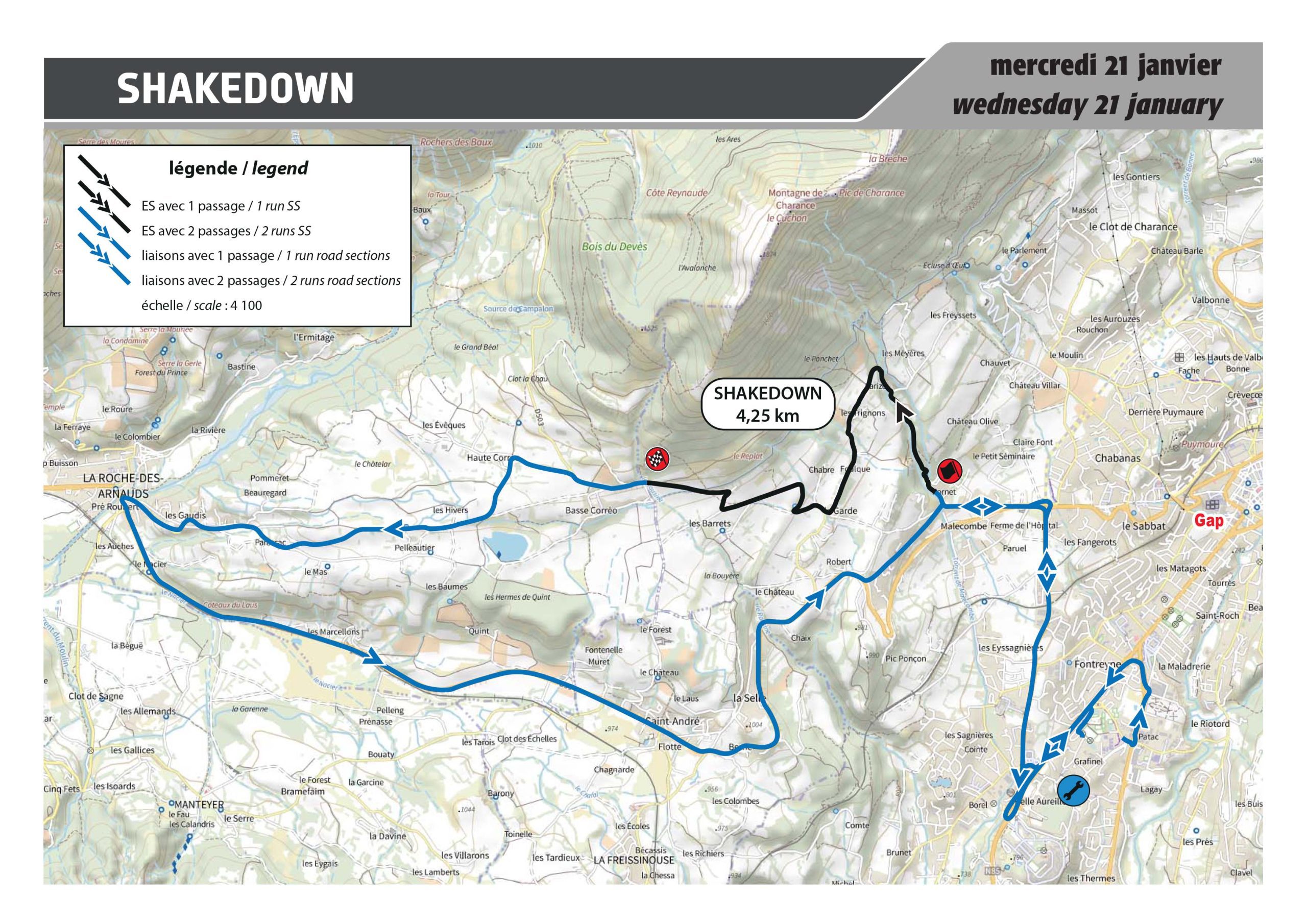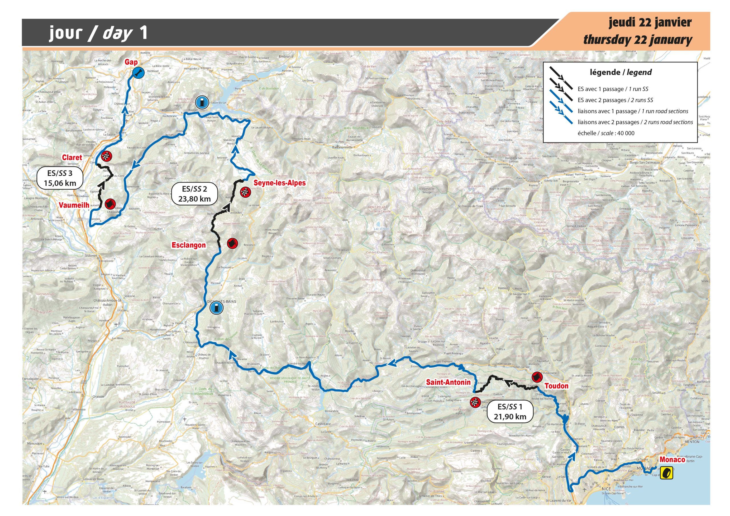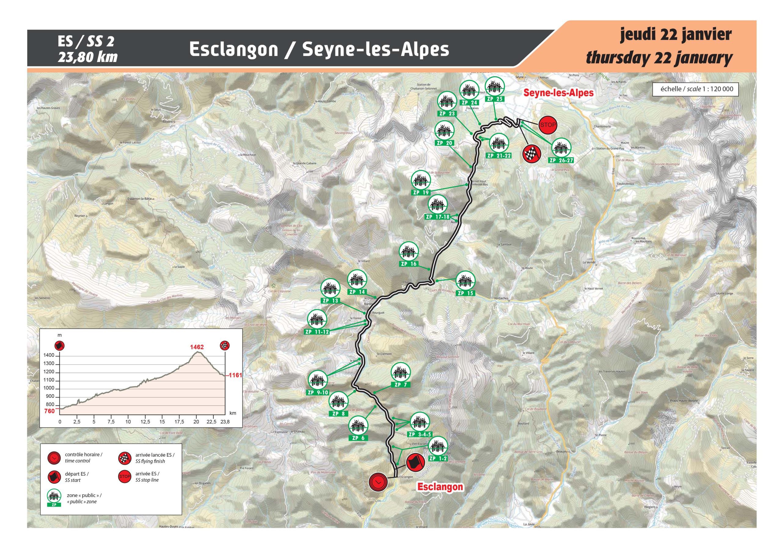 Contrairement à la version disputée à l’occasion de la 84e édition du Rallye Automobile Monte-Carlo en 2016, l’épreuve débute 3 kilomètres en amont, à Esclangon. Première difficulté, le passage dans les Clues de Barles avant d’enchaîner une partie étroite mais relativement très roulante jusqu’à Auzet. Le gain d’altitude aidant, la montée vers le Col du Fanget (1459m) devrait ensuite être verglacée voire enneigée, sur une chaussée qui devient de plus en plus difficile à appréhender. Changement de décor enfin avec la descente vers Seyne-les-Alpes, très rythmée et entrecoupée de belles épingles pour le spectacle…
