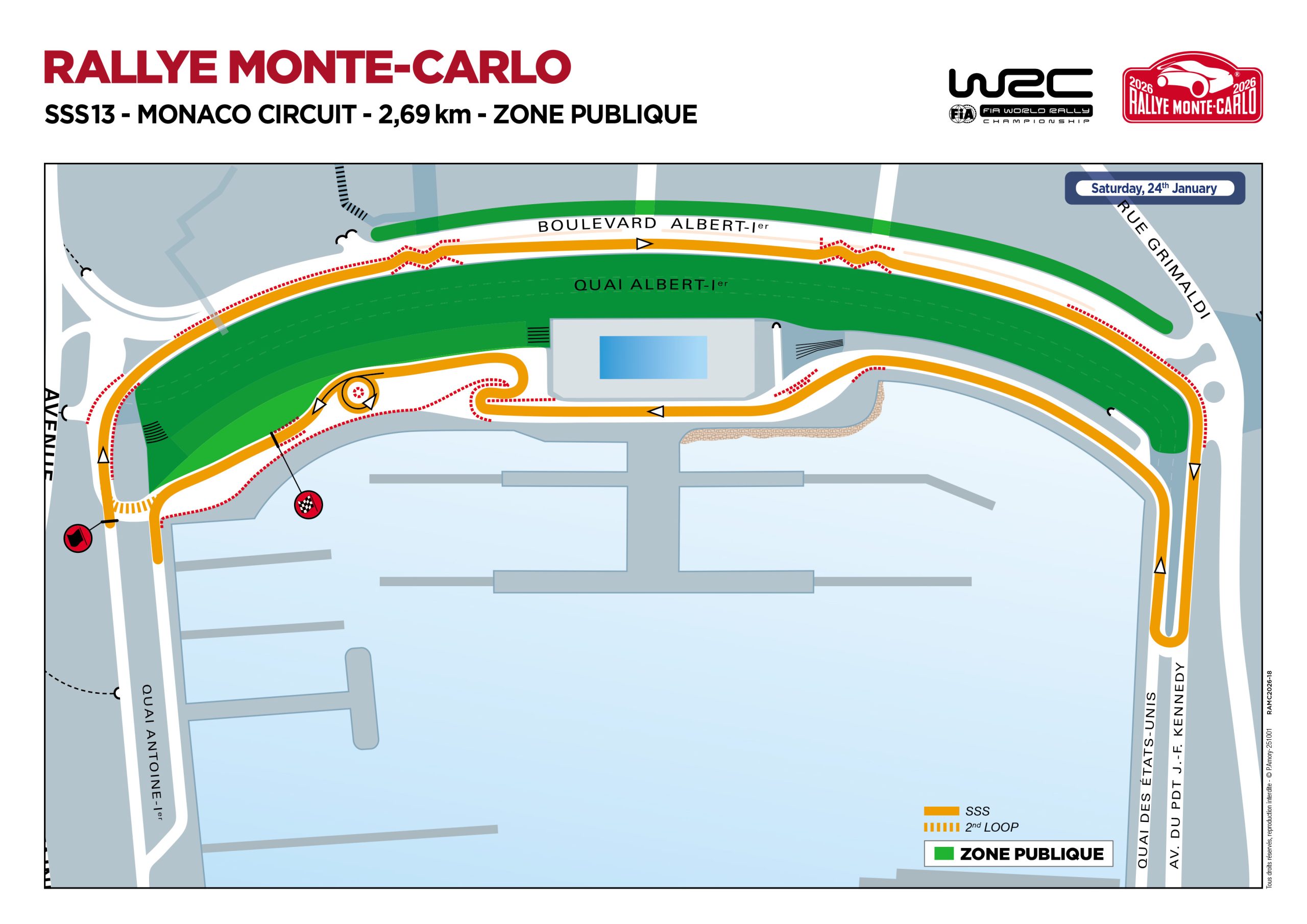 C’est assez rare pour être souligné mais la dernière super spéciale remonte à 2008 lors de la 76e édition du Rallye Automobile Monte-Carlo. Un tout nouveau parcours disputé de nuit avec pour seul et unique objectif : offrir du spectacle autour du Port Hercule et sur la partie basse du Circuit de Monaco. Ce tracé inédit permet de voir les voitures de course évoluer dans un environnement urbain emblématique, offrant ainsi aux spectateurs une expérience unique. Départ devant le restaurant du Quai des Artistes, puis légère montée en direction du virage « Noghès » avant d’attaquer le Boulevard Albert 1er où 2 chicanes sont à négocier avant d’atteindre le freinage de « Sainte Dévote ». Descente ensuite sur l’avenue Kennedy et le gros freinage précédant une épingle droite avant le retour en direction du « Bureau de Tabac » ainsi que le « S piscine » entre les rails. A la sortie de ce passage spectaculaire et très rapide, un gros freinage conditionne l’enchaînement de 2 épingles créées pour l’occasion, permettant d’offrir un florilège de freins à main. Pour clôturer ce show, un donuts (360°) sur une zone pavée ramène les concurrents devant la « Rascasse » pour effectuer à nouveau leur second tour de pur spectacle…